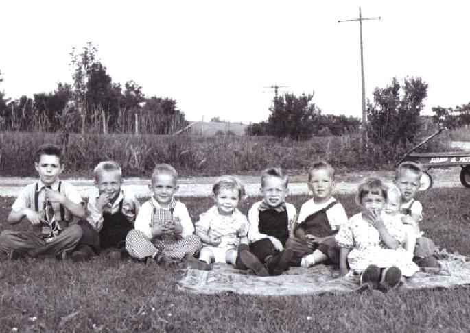Bib-front longs were essentially the same as bib-front shorts, except the pants were long. Bib-front longs were especially popular in America for younger children. The bib-front style seemed much more common in America than suspender longs. In contrast suspender shorts seem more common than bib-front shorts, but here age was a factor. I'm not sure about the chronology. I begin to notice them commonly in the 1930s. I know that bib-front longs were very common in America during the 1940s and early 50s. I remember wearing them myself. I'm less sure about the extent to which they were worn in Europe. I notice fewer images of bib-front longs in Europe, but this may reflect our greater access to American images. Bib-front pants were a style for boys. Girls may have worn overalls for farm work, but in general bib-front overalls and other bib-front pants were worn by boys. After World War II we start to see girls wearing them. In Europe this seems to have begun first in Scandinavia. An examplke is a Swedish girl in 1953.