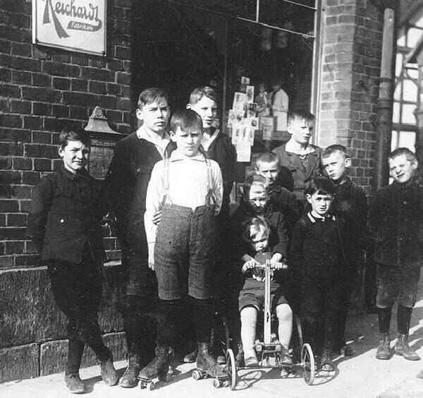 Figure 1.--Here we see a German stree scene in 1925. We note one boy wearing suspenders. Note that there are no belt loops on his shorts. The other boys may also be wearing suspenders, but as they are wearing jackets it is not possible to tell.