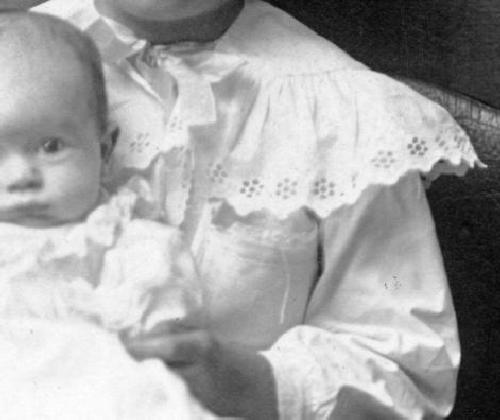 Note the white gown long gown that the baby wears. This was standard for younger infants. It was inconvenient when cghanging the baby, but could be folded over for warmth. Norice that the eyelet lace on the baby gown is similar to that on the older brother's blouse collar.
