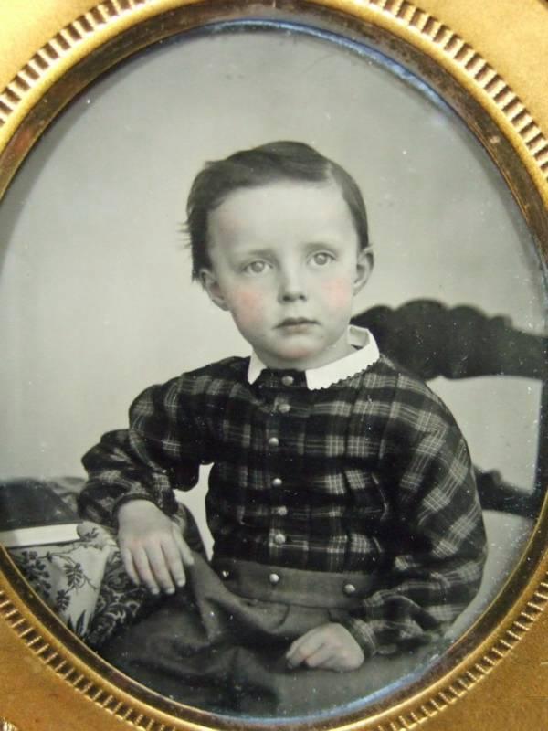 Often the collar is the most imprtant element and the style of the collar commonly is used to describe the style of the blouse. This is complicated by the adventbof detachbe blouses. Collars were often not done in the same materail as the blouse, but itbis norvenireky ckear wherthe werevdetavle or sewn on by mother. Generally the collars in the 1850s were realatively small--sometimes so small that they can barely be seen when jackets were worn. And you can see that the collar often did not eflect the material of the blouse itself. There were a wide variety of collar styles. We see both pointed and rounded tios or in the case her on tip at all. Younger boys might wear blouses witout collars, but sewed on frills. The tintype here is a good example of the small collars (figure 1).