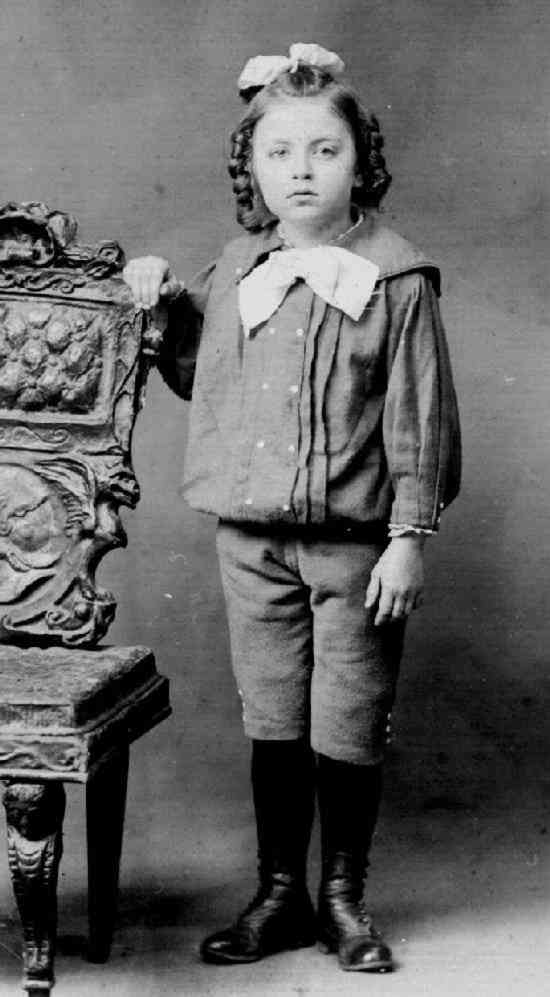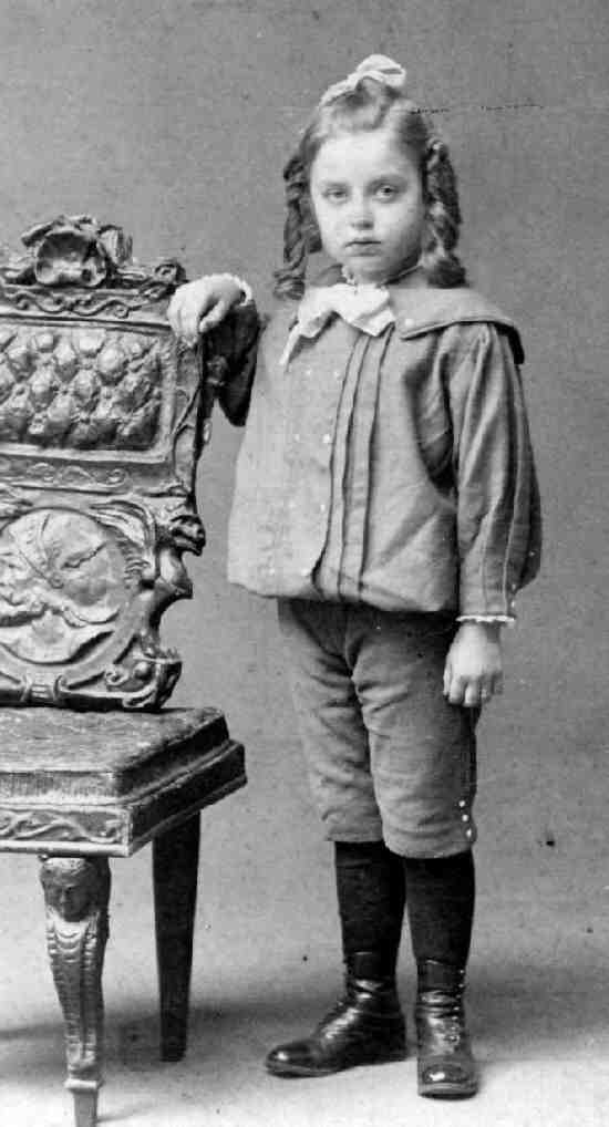 We have no information on the identity of this boy. We believe that he is American. We do know that he had an older brother. The two were dressed identically, but the older brother had a larger hairbow. His curls also differed somewhat. The plain blouses show here has some influence of sailor styling, including a back flap or small back flap, but without sailor detailing. There does seem to be a small back flap. They seem to be wearing some sort of shirt under the blouse.