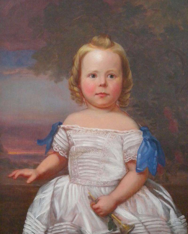 Necklines and collars varied a great deal. The neck features seemed to have varied over time. The chronological differences seem more important than gender differences. Children dresses in the early 19th century were often made without collars. A good example is an American boy, C. Olin Boyden in 1852. Some of these dresses also had low necklines. Two factors seem involved here. One it appears to have been fashionable. Two, ready made clothing was not yet available. Dresses without collars were much easier to make. A collar was a complication. Thus collarless dresses and blouses were very common for younger children in the firsthalf of the 20th century. Women's necklines could be quite daringly low until late in the 19th Century. This was often for formal occassions such as balls. We also notice young children with low necklines, both boys and girls. Here the factor was not formality, but as best we can tell the age of the child. Girls dresses generally followed the styles popular for their mothers. Boys until distinctive dress styles developed for them in the late 19th Century wore the same styles. This was particularly true for younger boys. We also notice a wide range of coolars on dresses. These could be both an integral part of the dresses or pin on styles. A popular pin on style was lace collars. We notice many different styles of collars used on dresses. A factor here was the greater availability of readt made clothing. And with industrial expansion during the 19th century family, many families could afford to buy ready-made clothing.