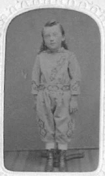 Both these outfits show Zouave styling. His mother appears to have liked the Zouave styling. The dress has a Zouave-type small jacket. An HBC contributor suggests the dress was "like a girls' dress, i.e., high waist at bust line and a little jacket just covering the bust." I'm not sure what the boy is wearing under his skirt--it looks like some kind of bloomer pants