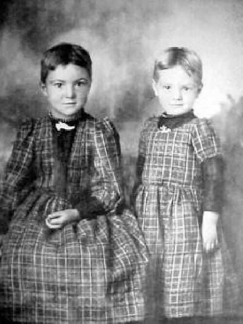 Figure 1.--These two siblings were from Clay Center Nebraska. One may be named A.I. Marsh. They wear identical plaid dresses. The child on the right is surely a boy. The child on the left we are ubnsure about. The child may also be a boy as well. |