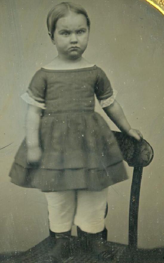 Boys and girls were still kept in similar dresses, even past the toddler period--often until about the age of 5 or 6 years. The style of those dresses changed as the child grew. Infants might wear long dresses. As the reached an age where they were learning to walk, the dresses were made shorter. Both wore "dresses" of cotton or wool around the house. The graceful, soft Empire dresses that allowed for freedom of motion had disappeared by the 1840s. Even little girls once ore began to be trussed up in bustles, stays, and bows. The usual child's dress was long or short sleeved to suit the season, with slim sleeves, round or boat-shaped neck and the waist was lightly fitted with a set-in belt. Preferred fabrics were linen and cotton, for ease of care. Little boys continued to wear dresses like their sisters. There were no dresses specifically styled for boys. An example is an American boy, Thomas Hardwick, about 1840 or 1841. We note an unidentified American child wearing a dress we think in the late 1840s, but we ae not sure if the child is a girl or boy. Another good example is two New York City children who we think were photographed in the 1840s.