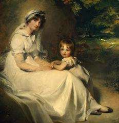 Much of the information we have on children's fashions in the early 19th century continued to come primarily from contemporary paintings. this is particular;y helpful when the artist identified. It was often still quite difficult to tell whether the children in paintings were boys or girls. Younger boys and girls were dressed virtully identically. Some clues help assess the identity of older children. As boys grew older some differentiation might be made such as less lace and frilly aplique, although in the early 19th centuries boys and girls often wore dresses that were indistinguishable. Boys outfitted in frocks during the early part of 19th Century often wore long pantaletts, often trimed in frilly lace. Other frocks might have embroidered, somewhat less feminine pamtalettes. We have noted a few boys painted barefoot, although this was not common. Other outfits for somewhat older boys were frock-like tunics. Sometimes props help identify the child. Farm implements, sports equipment, or boyish toys are good indicators that the child portrayed was a boy.