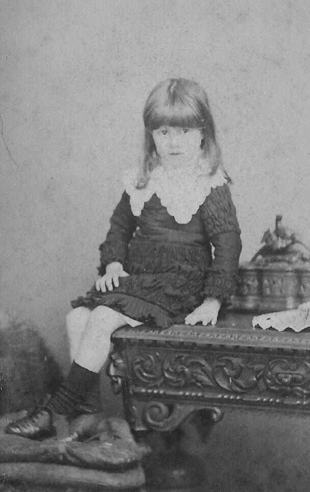 identically with dark ruched dresses, with perhaps a touch of white at the neck, pantaloons showing, dark socks, laced boots, c. 1885/6. This then makes sense. Many thanks. She is a girl, as the name on the back shows."
