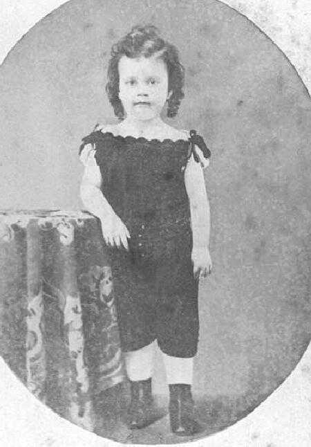 We note in some early photographs taken in the 1850s and 60s that young boys seem to be wearing a kind of transitional outfit that looks like the bodice of a dress, often with a low colarless neckline, and trousers. We do not know if this was also a European style. All of theimages we have are American. Nor do we know when this style began. We first see it in the 1850s, but his may be because 1840s photographs are quite rare. I believe that I have seen some earlier portraits by naive artists, but cannot recall specific portraits at this time. we assume that this fashion was a kind of transition from dresses to trousers worn with more boyish shirts or blouses. The boys pictured look to be about 4-6 years old. Many have their hair done in curls. Most clothes in he 1850s or 60s were still largely hand or home make at this time or very expensive. Mom probably just removed a skirt from a dress and made it into pants. The pants look not to be well made.
