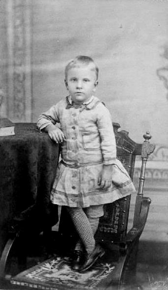 We do not know a great deal about the underwear boys wore with dresses. This is because our primary source of infotmation is the photographic record which does not provide a great deal of information about underwear. The underwear boys and girls wore was similar and in some cases identical, but there were some differences. The basic choices in addition to union suits were petticosts, pantalettes, and pants. We note all three. Both boys and girls wore petticoats and pantalettes, but pants were exclusively for boys. Pantalettes could be fanct, but some were plain and mihht be called drawers. The primary difference between plain pants and pantalettes was the material used. Presumably boys wearing pants wore some kind of underwear under the pants. It is sometimes difficult to tell the difference between pantalettles and pants--primarily meaning knee pants. Here a helpful factor is that underwear was usually, but not always white. Our ability to assess this is limited because children commonly wore dresses and other skirted garments at rather long lengths. Here there were differences over time and among countries. And to the extent thhat hem lines rose we have more information about underwear. European mothers seemed more infortable with higher hemlines showing more of the child's legs than American mothers. This convention can also be seen in hosiery choices. With long hem lines we commonly have no idea as to the underwear being worn. Chronological factors are also important. A reader writes, "From catalogs at that time, children under the age of 6 or 8 usually wore pantalets or drawers that buttoned to an underwaist. This makes sense because children still had toileting issues. I notice that in some catalogs from Best & Company that boy's wore drawers (miniature version of men's style) with yoke front button closure and a fly. The pantalets did not have a fly so at some point when a boy could toilet without help, they graduated to drawers. The age seemed to vary greatly as mother's seemed to be more