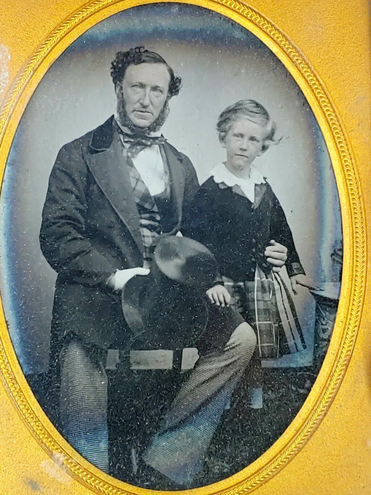 We see more English photographs in the 1850s. And the new Ambrotypes ppeared. But still we see relatively few examples. We have not been able to find many English Dag and Ambro portaits. Photographs from the 1840s and 50s are much h rarer than in America. We think some English boys wore kilts in the 40s and 50s, but we have found few photographs outside the royal family. This may bebecause of the limited number of early portraits rather than prevalence, but it may reflect actual prevalence. Early formats (Dags and Ambros) were relatively expensive. We note Lord Elgin with his son Victor Alexander who is wearing a Highland kilt outfit with a black military jacket about 1855. They apparently had their portrait taken during a trip to Paris. Lord Elgin was Scottish, but the family spent areat deal of time in London and foreign postings. Victor was born in Montreal, Canada. We hav found san img of another boy wearing a kilt, agasin uth his father. Thiscwas an Ambro, probsanlt tken in the late-1950s. The portrait was tken in Brighton. This could mean he lived there or the family was on vacation.