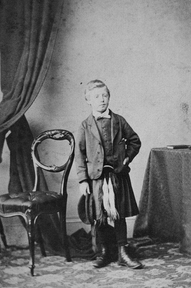The Prince of Wales' two boys were born in 1864 and 1865. The eldest son was Prince Eddy. We know that both Prince Eddy and Prince George wore kilts as boys, we think largely to please their grandmother Queen Victoria. We are not sure when they began wearing kilts. Queen Victoria would have insisted on it at least when they visited Balmoral. We are not sure what the Princess of Wales thought about the kilt. Our earliest photograph of Eddy and George wearing kilts dates from the 1870s when the boys were 12-13 years old. We notice ordinary Scottish boys wearing kilts. We do not have a lot of Scottish images from the 19th century yet. We have found one CDV portrait of an unidentified Fife boy wearing a kilt and sran with an ordinary suit jacket and vest. The portrait is undated, but looks like the 1860s to us. The early-70s is possible. The ordinary suit jacket suggests that this was an outfit he commonly wore, including to school.