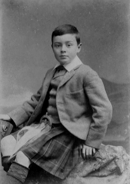 Vest (waistcoats) were common with the cut-away jackets, both with small lapels or with no lapels. We are not sure, but believe that light-greens and browns were the most likely colors. Gray is another possibility. The jackets seemto be flannel. We see these jackets worn with many of the same regalia with which the black military jackets were worn, such as a feather (only chiefs were entitled to wear an eagle feather), dirk, cap badge, gloves, and other items. Scottish boys wore both Barmoral and Glengary caps with their kilts. Some fashion experts insist that the Balmoral should not be worn with the kilt. After the turn-of-the 20th century, especially after World War I, we begin to increasingly see shirt single-breasted jackets, looking somewhat like blazers. Most were done in tweed. We see light browns and greens. Until the 1920s this was almost always with an Eton collar. The Eton collars were often wirn with small black bow ties. Eton collars were still common in the 19230s, but had become less so by the 30s. These short jackets became the primary jackets worn with kilts. For formal events like wedding , various regalia might be added. For less formal events like school, the regalia was generally not worn, except perhaps the sporran. Obviously the dirk would not be worn.