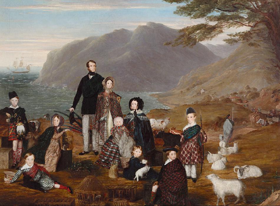 a sheep-walk at Loch Quoich. They removed over 500 tenants, most emmigrated to Canada which had been added to the British Empire. lands. Donald Cameron of Lochiel in the 1780s began clearing his family lands, which extended from Loch Leven to Loch Arkaig. Sir John Sinclair of Ulbster brought the first Cheviot sheep to the Higlands. His Caithness estates were cleared fir them and the later became known as four-footed Clansmen. (Cheviot became a popular fabric for sailor suits and other boys' garments in the 19th century.) Similar clearances were conducted thoughout the Higlands. These clearances changed the very character of the Higlands. The population was removed so sheep could be raised on large estates. Landowners found that it was far more profitable to raise sheep for wool, which was much in demand, than rent the land to small scale teneant farmers. These farms had offered only a meager living to the tenants, but of greater concern to the landowners, only minimal income. It has supported, however, the poulation of the Highlands. As the Higlands were cleared, clansmen and their families had to leave the land where their families had lived for centuries. The clearances left the Highlands void of most, perhaps as much as 90 percent, of its population, trees and forests. Vast streaches are baren and deserted even today.