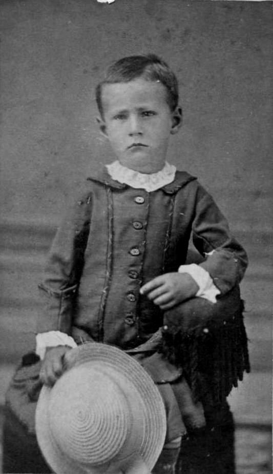 We see these these rounded-crown hat done in a variety of material, both straw and fabric hats. Some were done in felt. Some seem to be the same fabric as the suit, suiting material matching the suit. This mean thst were soth soft and fully shaped hard hats. Both felt and straw could be shaoped in a hard style. It is not always easy to determine the material involved from the photograph. The easiest to spot are straw hats. Straw hats were introduced a decade or more before kilts suits became an important style. Straw hats were worn by the 1830s, but did not became a fashionable mainstay until the really well made Ecuadorean straw hats (called Panamas) were popularized by the 49ers headed to califiornia to hunt for gold. Straw hats persisted even when the kilt suit disappeared after the turn-of-the 20th centuty. The most common hat style for straw was the rounded crown hat. There were also flat topped boaters, but this was a style less common for boys--especially during th 1870-90s. And the same general trend is the case for rounded-crown hats in general made of the other materials. The choce of material affected both the hat band and the stremers (figure 1).