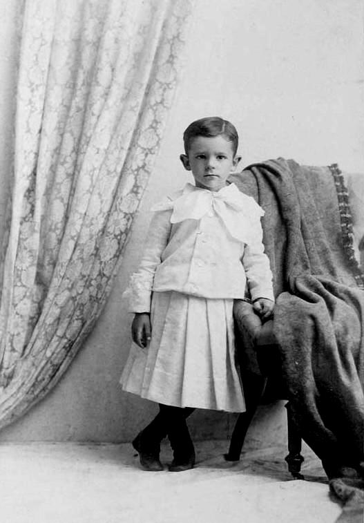 We even see a few white kilts, but they were not very common at all. While colors are virtually impossible to identify, we can usually identify white kilts. We might misidentify very light pastels, but we do not think that such light colors were common for boys. Thus we are fairly confident that the kilt suit outfits that look tgo be white in the photographic record ctually were white. The number of hilte kilts we have found are very small. We have found a few complete white kilt suits. Boys might wear white blouses with white kilts instead of a white jacket. A white kiltsuit would have been for summer wear and of course for summer wear a blouse would do nicely. And of course mother might add a white floppy bow to complete an elegant touch. What we do not see is white long stockings with these white kilt outfits.