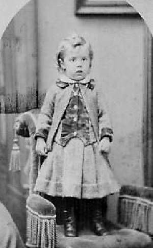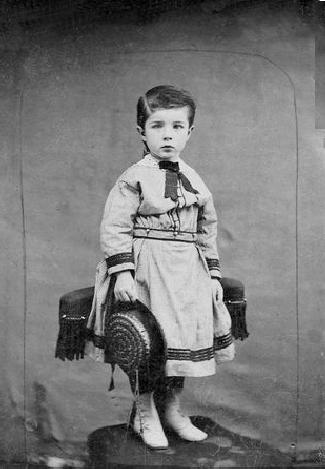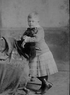 The kilt suit continued to be a major fashion for younger boy i the 1880s. We note large numbers of American boys wearing kilt suits throughout the 1880s. We note Frank Bigelow in the early 80s. Note that there was no Scottish elements. This may have been the peak of popularity for these suits. They were one of the most popular outfits for pre-school boys. We see them being worn throughout the country. We note boys from about 3-7 years of age wearing them. They seem to have been as about as popular as dresses for younger boys, although there could have been age differences here. We do not note any change of popularity during the decade. We do note changes in the styling of the suits. Boys in the early 80s wore the same styles as worn in the 1870s with the sack suit jackets generally replacing the cut-away jackets. We see an important developmnt at mid decade. Mrs. Burnett's publication of Little Lord Fauntleroy. It had a mjor impact on boys' fshions, especially in the United States. Until Mrs. Burnetts book, American boy fashions were rather staid. uddenly we see boys weaing gflanboyant outfits. Andthis included the kilt suit. Quite a few kilt suits after 1885 were made as Fauntleroy kilt suits. This was a small black velvet cut-away jacket made with a plaid skirt-kilt. The plaid for these Fauntleroy kilts tended to be brighter than used for the standard kilt suit. We see fewer of the kilt suits with cut-away jackets in thge 1880s with the exception of these Fauntleroy kilt suits. They were worn with the fancy Fauntleroy blouses and often large floppy bows. Most kilt suits even during the Fauntleroy era were not done as Fauntleroy kilt suits. But we see boys wearing regular likt suitswith a variety of Fauntleroy itemssuch asfloppy bows and lace or riggled collars. They were worn with a variety of headwear. We do see some such as Kansas boy. We note kilt suits being worn with striped long sockings in the early 80s, but dark, solid-colored stockings gradually became more common.
