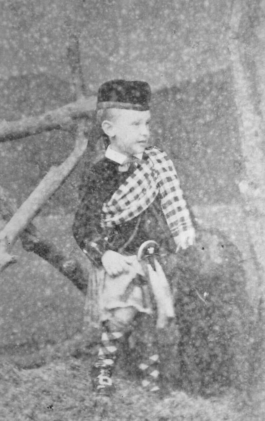 It appears that kilts were worn by fashionally dressed boys. It also appears many poor boys also wore simple kilts. It is clear that tartan suddently became fashionable among affluent fashion-conscious Englishmen when King George IV wore a kilt during a visit to Scotand (1832). The fashion conscious suddenly wanted to wear a kilt also. It is unclear how this trend at first affected boys. It is likely that this fashion trend included boys--at least among affluent families. Earlier the kilt was generally considered a garment for poor uncultured Scottish highlanders. English boys would not have worn a kilt earlier. The new kilt fashion was made popular for boys in the 1840s when Queen Victoria and Prince Albert began dressing the young princes in kilts. A curious dichotomy became apparent at mid-century. Kilts were worn by poor Scottish boys whose parents could not afford trousers and rich Scottish AND perhaps by English boys as a fashion statement by their parents, especially after Victoria began dressing the princes in kilts. The kilt became extremely fashionable for boys in the mid-19th Century. One Scottish HBC contributor reports that kilt wearing by boys in Scotland began to spread from the affluent and middle class to urban or non-Highland 'respectable' (more affluent) working class in the 1880s, although HBC can not yet substaniate this in oart brcause of the cacrity of 19th century Scottish photographs. It is clear that kilts in Scotland and even England were a popular outfit for fashionable boys clothes. It is less clear to what extent the kilt was worn by boys for day to day wear. Also HBC is not sure how kilt wearing varied among different economic classes. Even Scottish contributors to HBC are unclear about the prevelence of kilts at mid-century. Some sources suggest that Scottish boys were commonly wearing kilts by the 19th century. Definitive information, however, is not available.