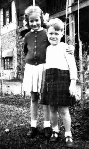 Figure 1.--This Scottish boy looks to have been photographed with his sister in the 1950s. He wears his kilt with white socks and strap sandals. |