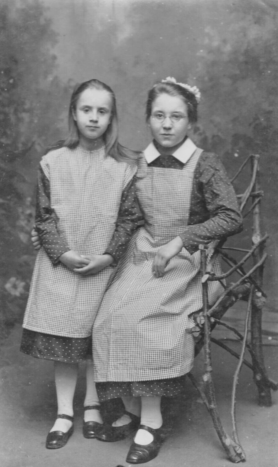 We see pinafores done with in flat color as well as patterns. The flat colors were by far the most common, especially white pennies. There were colored pinnies, but the white ones were the most common. It is clear that white was the most common color. We are not sure about the actual colors given the black and white photography of the day, but they mostly look like muted colors. We suspect that there were not many bright colors, but that needs to be confirmed. There are paintings and we do not see bright colors. Most are light colors whuch can be confirmed from the photograophic record. We have seen a few dark-colored pennies, oprobably black or dark blue. This all seems up to mother's disgressions, but older girls may have had something to say about their pennies. There were also pattened pinnies. The patterns varies, but checks seem popular. We notice some images showing all or most of the girls wearing wearing white pinafores. There are, however, some images we hav archived which show quite a few girls wearing colored or patterned pennies.