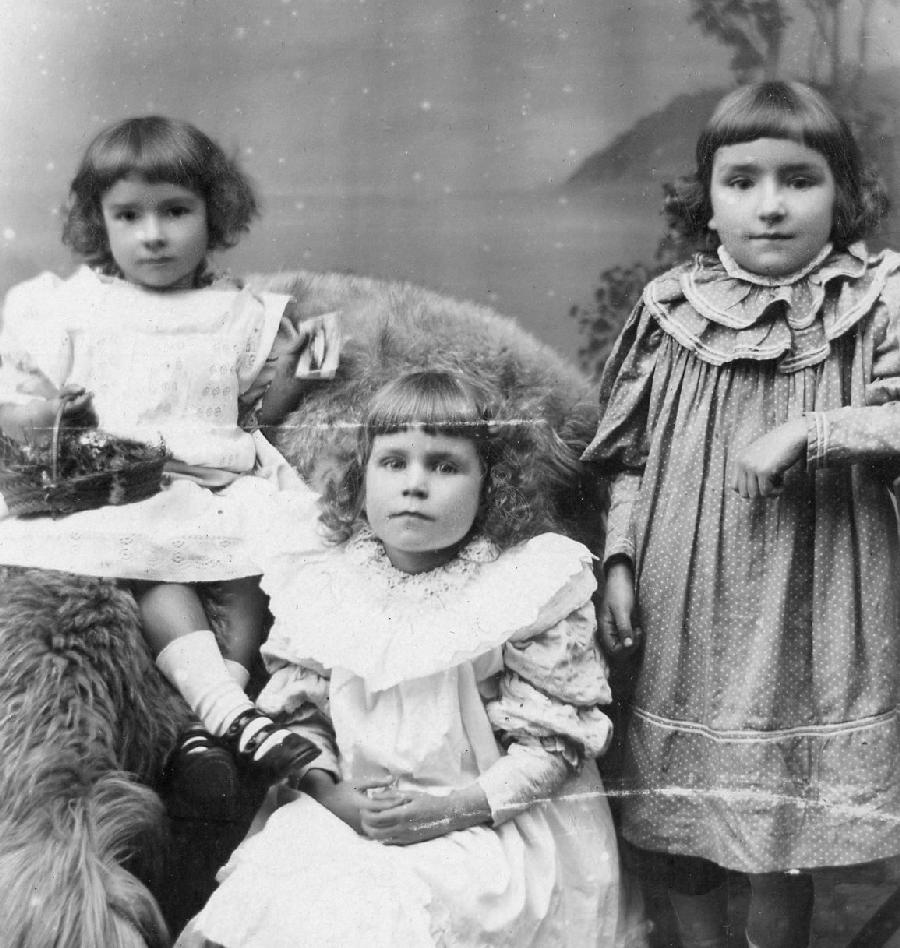 An English cabinet card shows two unidentified chilren and a lady. We are not sure if the lady is a young mother or a nanny. The children look to be about 2-4 years of ages. Both wear colored dresses with puff sleeves and white pinafores. The younger child hs a wide waist sash. The portrait is undated, but looks like the 1880s to us. We have age details about another boy. The boy here, Freddie, is 2 years old going on 3 years in 1894 (figure 1). He wears as whire pinfore over a colored dress.