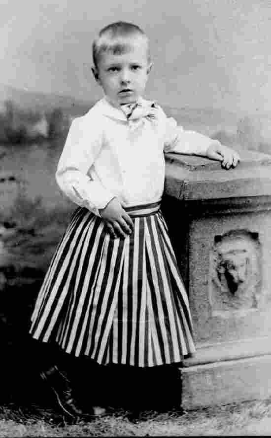 Figure 1.--This Connecticut boy wears a stripped skirt weith large pleats. Notice the belted trim and small plaid bow. HBC would date this image about 1880. Some boys wore skirts and blouses. |