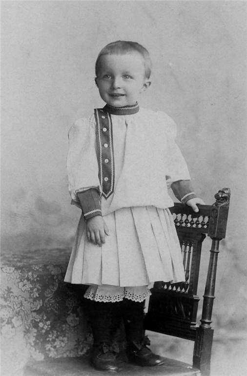 We note German boys wearing pantalettes into the 20th century. The unidentified boy here wears a white Russian blouse with colored trim and a white kilt skirt with broad pleatts (figure 1). We're not sure about the color. The pantalets look like they are trimmed with eyelet lace. The photograph is undated, but looks to have been taken about 1905. Our German reader tells us, "Two children are from around 1900. Both are girls. Both wear pantalettes with long black stockings."