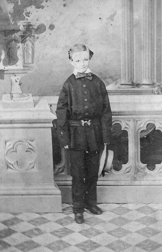 Tunic suits consisted of the tunic and pants. By the 1860s they were mostly matching garments. We call these garments tunics, but most of what we see in the 1860s button up the front and might be called long jackets. Here we see a good example, another unidentified English boy from the 1860s (figure 1). It is a long tunic, falling to between the knees and the waist. It is worn with below the knees knee-pants. Early tunics seem to have been more like smocks. Portraits during the first haff of the 19th century show boys wearing tunics with long trousers. We note shortened-length pants (knee pants and bloomer knickers) for the first time in substantial numbers during the 1860s. Of course the 1860s is the first decade in which we see shortened-length pants with tunics. Unfortumnately we do not yet have many images from the 1850s. An example is the younger brother in an unidentified family portrait of three boys. Most of the tunics were belted, but we see some unbelted ones.