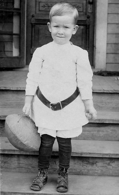 Many catalogs specified 2 1/2 years as the beginning of the age range for tunic suits. Tunic suits were popular outfits for American pre-school boys beginning about age 2 or 2 1/2. Some families dressed all their pre-school boys in tunic suits. The sizes indicated by catalog stores provide a fairly definite age range. We notice tunics suits made in size 2s, often 2 1/2. Thuis is the youngest we have noticed for these outfits. A good example is a variety of tunic suits offered by Montgomery Ward in 1914. The age range was 2 1/2 to 7 years. An even more common range was 2 1/2 to 8 years in the 1900s. This wide age range gradually became less favored because many 8-year olds who were in school did not want to wear the same styles 2 and 3 year olds were wearing. Rather they preferred the styles being worn by the older boys. This was a common beginning age for these suits. Almost all tunic suits we have noted were done in size ranges beginning at 2 or 2 1/2 years. Some began with size 3, but the size conventioin was much more common. Even when tunic suits began to go out of style in the late 1910s and early 20s, we still see them being done in size 2s.