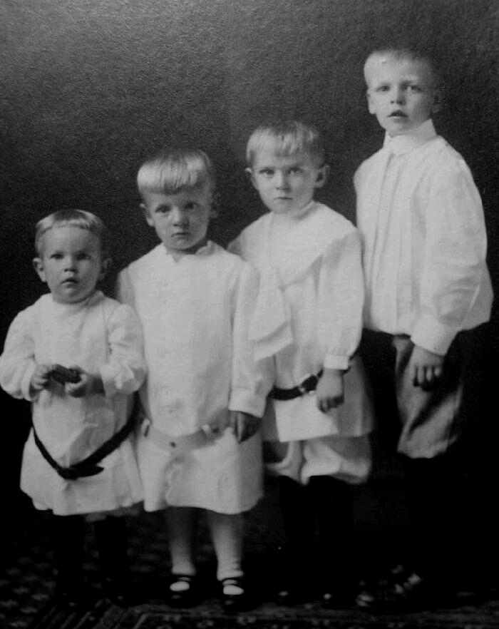 We notice quite a few 2-year olds wearing tunic suits. Given the age range in catalogs, we suspect that they were even more popular for 3-4 year olds, but we notice a substantial munber of 2-year olds wearing tunic suits, at least in the early-20th century. We suspect that we see a lot of 2-year olds wearing tunic suits in part because after the turn-of-the 20th century, the practice of dressing younger boys in desses rapidly went out of fasion. This was a trend that was noticeable in the 1890s, but much more pronounced after the turn of the century. Thiswas the last skirted gament to be commonly worn by boys, even younger boys like 2 year olds.