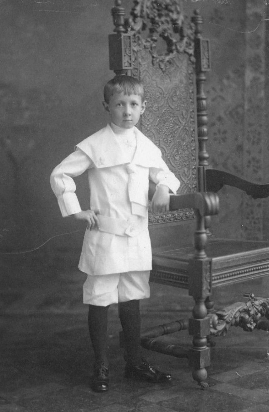 Most tunic suits in the 1900s and early 1910s were made in age ranges that included 6 year olds. And we notice quite a number of boys wearing them in the photographic record. This surprised us a little because this is the age American boys begin school. A good example is Carl Kellison about 1910. He was 6 years old, but may not have begun school yet. We believe that tunics were less common for 6 year olds that had begun school because most boys stopped wearing them when they began school, at least for schoolwear. Another factor is that not all 6 year olds were in school. They only began school if they had their birthdays by September. Which means that boys who turned 6 after September began school the following year.