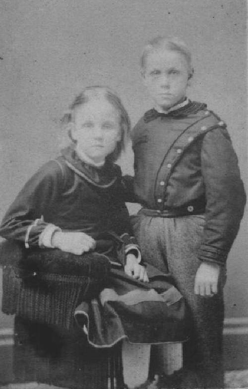 Figure 1.-- We are not positive, but we see some images that look like boys are wearing their smocks like shirts, tucked into their trousers. This looks to be the case here. This is a CDV style photograph as can be seen of two children, a boy and girl, I am assuming a brother and sister. This CDV was taken by A. Wheeler, Depot St. Unadilla, NY. This CDV is not dated nor are the children identified. It looks to have been taken in the erly 1870s. |