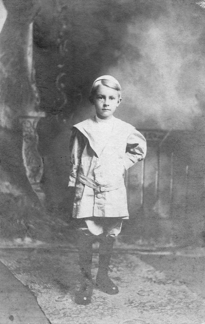 The peanie was similar to a peaked rounded crown cap, better known in Britan as a school cap. The difference of course is the peak or bill. This is a major difference with the more modern peaked cap. In the 19th and early-20th centuries, however, many of these peaked caps has very small peaks. In some cases the peak is so small that theyalmost look like beanies. And we have found a few images in which they actually look like beanies. Beanies and peaked caps may have been chosen because the color and even the material could havevbeenbchosen to match the tunic suit. We do not, howver, see many examples of either caps and beanies being worn with tunics. Buster Brown was never pictures with these choices. We believe that many mothers saw caps as only suitable for somewhat older boys. We believe that given our very substantial American archive that the prevalence in the images we have found are a realtively good indicator of actual prevalence. Of course mother may have affected headwear choices for formal studio portraits, but note in the home snapshot on the previous page the boy is wearing a rather formal wide-brimmed hat.
