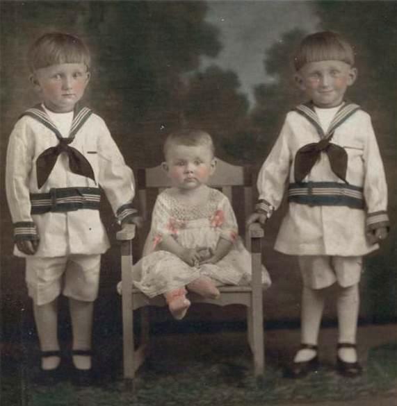 Sailor tunic suits came in several different colors. The most common was white. We also note white tunics with blue trim, including stripes. We also note quite a few blue tunics. The blue was done in various shades. The boy here is probably wearing a light-blue suit (figure 1). We also notice red whichh was also commonly used for detailing. There were also brown and grey suits. These colors were popular as play suits because they did not show the dirt as much as white suits. Other colors were less common. This is a difficult topic to research because the photographs were black and white. We have found some colorized portraits and some infirmation is available from catalogs.