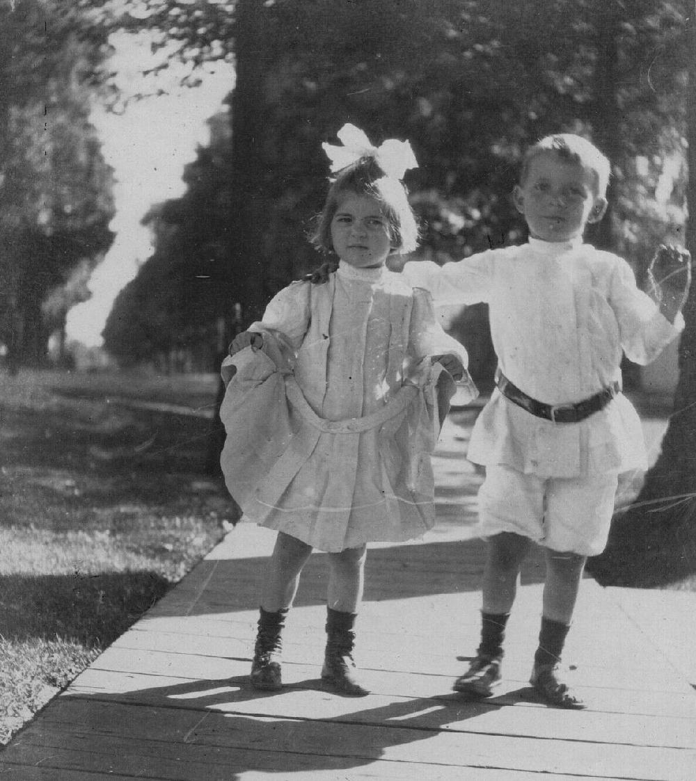Generally studio poertraits show how the children would be dressed for dressy studio occassions. After the turn-of-the-20th century we begin to see many outdoor family snapshots. Giving us views that were only rarely available in the 19th century. Some look rather dressy. The snapshot here is a good example (figure 1). Although here it looks to us that mothr has dressed up the boy for the photograph. Often the outfoot can be made to look dressy by working on the boy's hair and adding long stockings and dressy shoes. In this case long stockingd and sandals is a bit of an odd cvomination. And motice how this ia a staged sanpshot with the boy done up a bit so the bniy can show off his fancy new peddal car. This is not a play situation, but is a casual scene at home. Other snapshots do show boys in actual play situations or on outings with parents in which the tunics are being worn as casual garments.