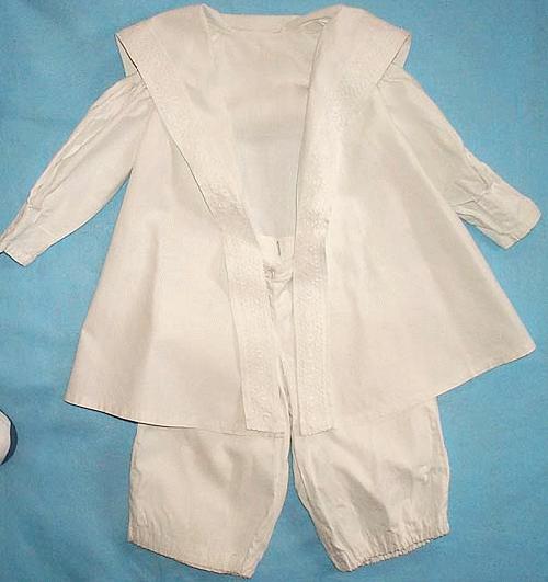 This emacualte sailor suit was worn by an American boy about the turn of the 20th century. It was made in white linnen. The tunic had basic sailor styling with a "V" front collar and back flap. The "V" front is cut much deeper than on a normal middly blouse. The tunic is all white without any colored detailing as well. The bloomer knickers have elasticized legs. They seem to havebeen made to wear above the knees.