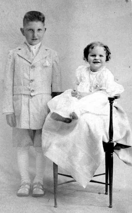 This is a studio portrait of an unidntified boy and his baby sister. He looks to be about 7-years old. He wears a light-colored Norfolk suit, we think with knickers. Knickers were more common in America thn any other country. We are not sure about his shirt. He also wears white long stockings and sandals. We would guess the portrait was taken in the 1910s which is when American boys began wearing knickers. We see younger American boys wearing white long stockings in the 1900s and 10s as well as the easrly-20s when dressing up. Sandals were less popular with american boys than European boys, but we do see some American boys wearing them in the 1900s-10s. We see fewer American boys wearing sandals in the 1920s and subsequently.