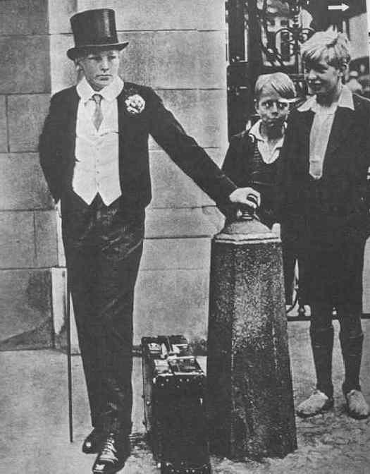The Eton suit was initually the style worn by the boys at an exclusive English "public" school. The style is of course most associated with Eton College for which it was named. Actually many other public schools adopted the Eton suit. The boy on this page, for example, is a Harrow boy--not an Eton boy. Often there were only small differences in the suits to destinguish the different schools.
