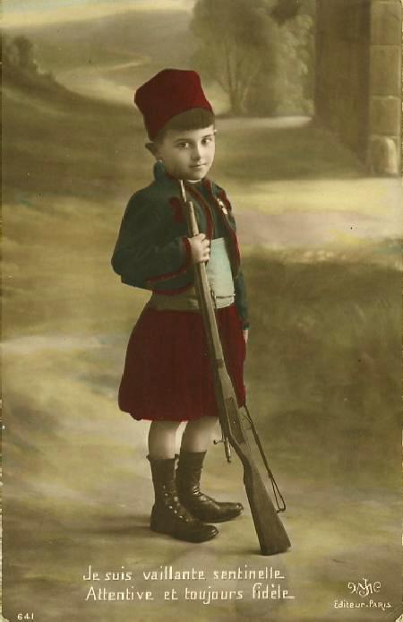 The Zouaves saw service in other French campaigns outside of Algeria beginning with the Crimean War (1854-56). They subsequently served in all of the major French military campaigns, including the Franco-Austrian War fought in Italy (1859), the Mexican Intervention to support Maximillian (1864-66), and the Franco-Prussian War (1870). They also served in other French colonies, including Tunisia and Tonkin (Vietnam). One observer writes, "These units quickly became the “elite forces” of the French Army and during the Crimean War, their heroic efforts and brave actions brought them to public notice, not only in France, but all over the world." [Harriman] French defeat in the Franco-Prussian War resulted in a major reform of the French Army. The Zouaves lost their status as an elite force of veteran fighters and became a conscript force recruited from French North African settlers, bith in Algeria and Tunisia. To fill out the ranks, conscripts were added from southern france. The Zouaves were expanded just before the outbreak of World war by men recrited from the Pris area. The four Zouave regiments began the War in their characteristic brightly colored uniforms. The lethality of modern weapons (machine guns and artillery) soon brought about a chsange to a khaki uniform (1915).