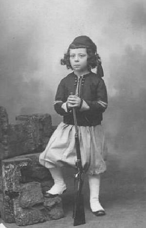 Many boys' outfits were done with Zouave styling. Less common was an actual Zouave uniform done for boys. As unlikely as it may seemat first glance, American Civi War units were outfitted in the Zouave outfits. Of course this was much more common in France. And as aresult, outfits were made for boys with the Zouave styling. We do not think this was very common in America, based on their relative rarity in the photographic record. But we do see occassional examples. We suspect most of these would have been made during the Civil War (1861-65). The Zouave styling continued for a while, but the actual uniform outfits seem most likely to have been taken during the War, at least in America.The back of the postcard has Cartel Postel, so its defintely printed in France, the uniform is exactly patterned after the Civil War uniform (Lords Encyl) and as for the time period, it appears to be WWI era, unless it is a copy of a much earlier photo.