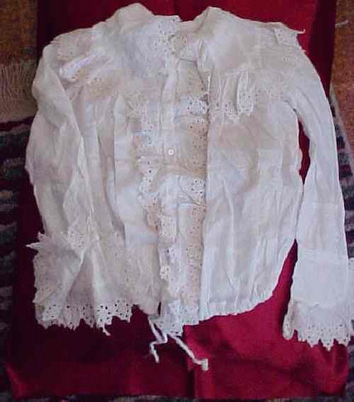 The blouse pictured here was advertized on e-Bay.  It is a white, light-weight linen or cotton with cut-work lace trim.  Clearly a late-19th centiry Little Lord Fauntleroy blouse, as the sellers says, " for good little boys!!"  It is handmade with full