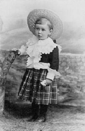 We are not sure just what headwear was worn with these Fauntlerpy kilt suits. Many of the available portraits show the boys without any headwear. We do know that the boys wore broad-brimmed hats, often with streamers. The hats while large were generally plain. In a fe instanced we have noted famcy decorated hats. We think that this was probably the most common headwear. And we have photographic evidence conforming that these caps were worn with Fauntleroy kilt suits. Contemporary illustrations certainly suggest this. Our photgraphic evidence is more limited. Thus we are not entirely sure. The broad-brimmed hat certainly was not the only headwear. Here we need more information. we are just not sure what other styles were worn. We suspect that one popular style was the Scottish Glengary cap.