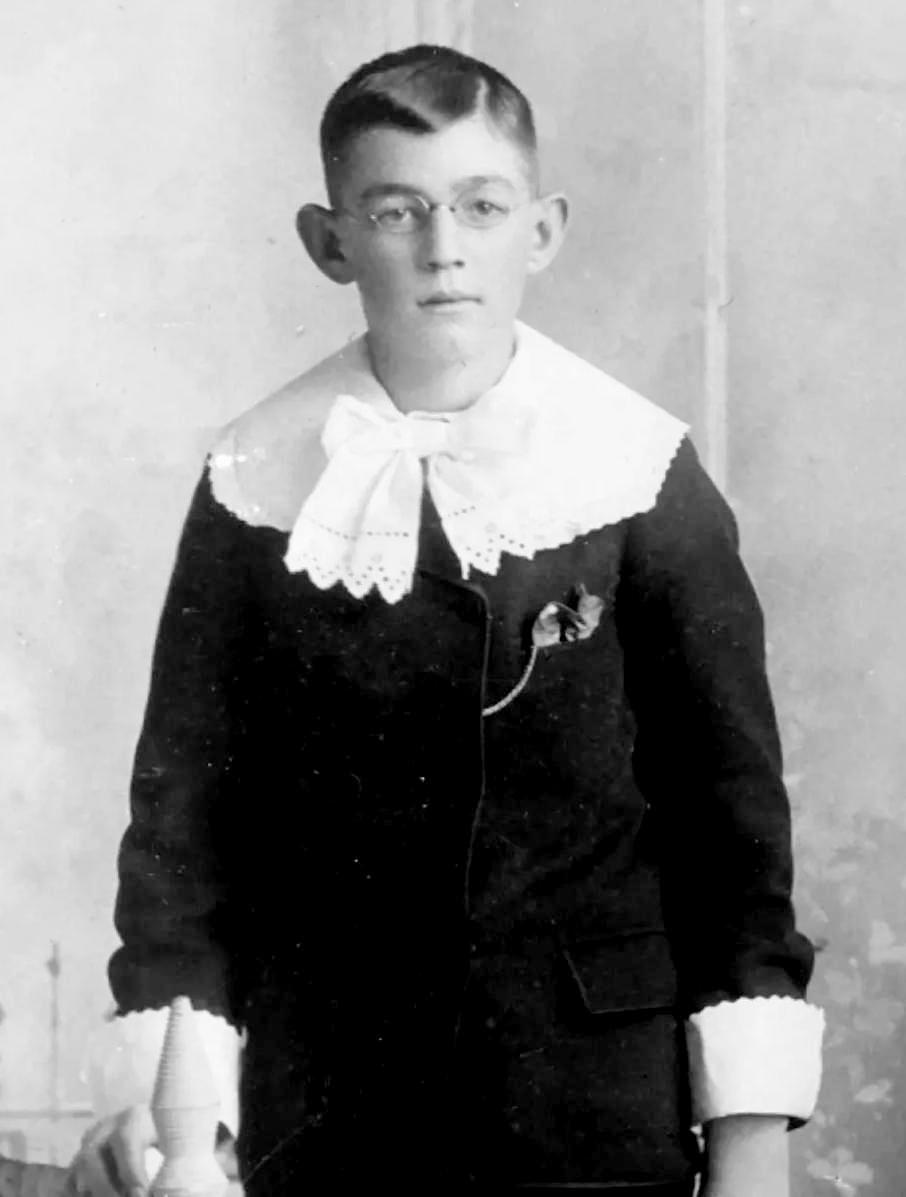 We no lonnger see boys age 10 years waring the classic Fauntleroy cut-away jackets. What we do see with the older boys is awide range of Fauntleroy elements like large collars and floppy bows. Many were large but fairly basic paliain or reuffled collars, but some were elaborate, fancy blouses. Boys at age 10 years and even older boys might wear a basic Fauntleroy blouse, but we see only a few boys at this age wearing the really fancy ones. Blouses with wide collars and a little ruffled trim were fairly common. We see boys wearing them with and without jackets. Here there was a seasional factor. The really fancy blouses with real lace both at the collar and down the front and at the wrists were not very common for 10 year olds. We see a few examples, but not very many. Boys wore standard lapel jackets. When worn open, they look rather like the cut-away jackets. We also see the fancy blouses worn with collar buttoning suits.