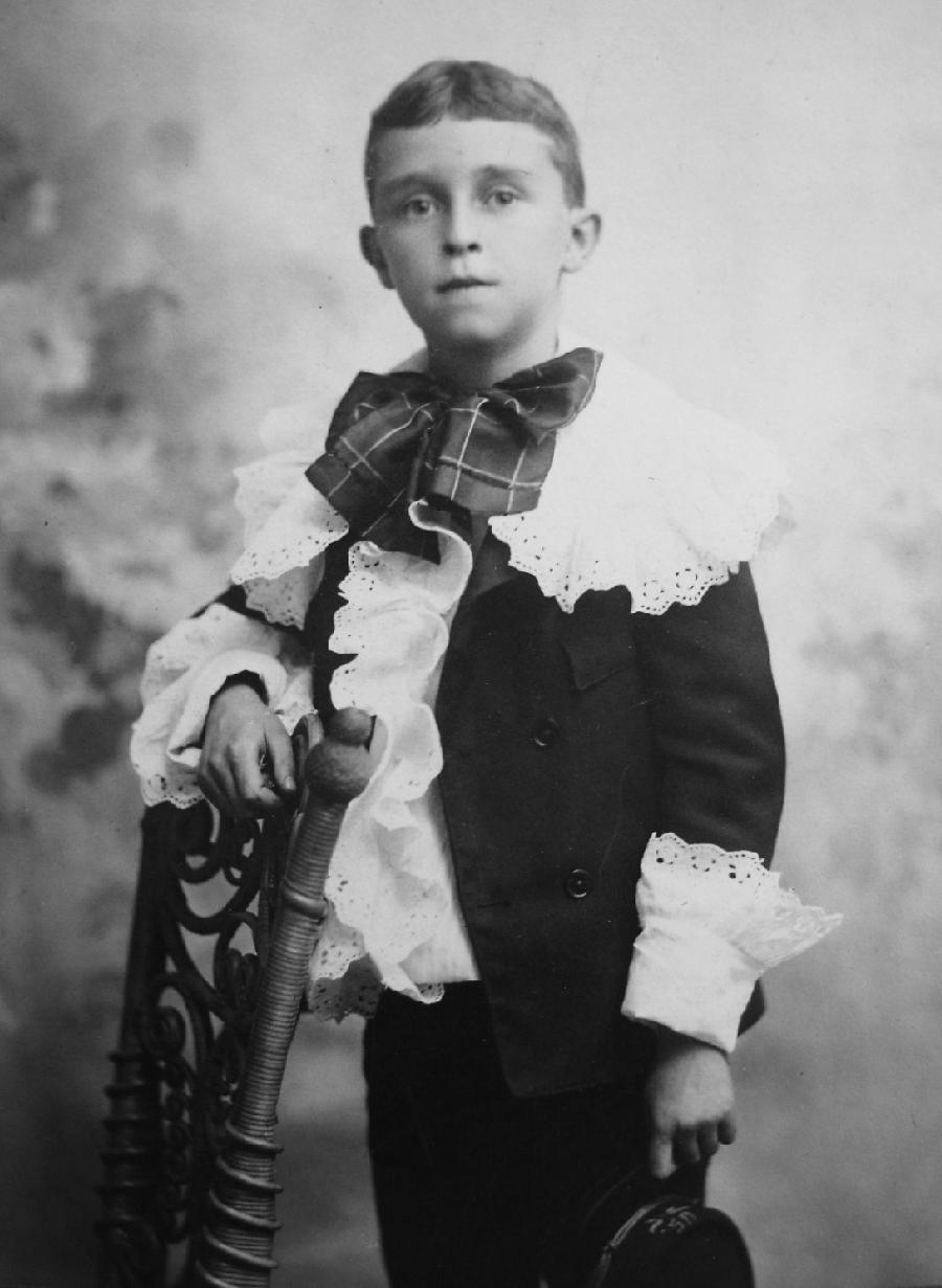 We still see quite a number of boys a age 6-years wearing Fauntleroy suits. Not as many as at age 5, but still quite a number. A major factor here was school. Age 6 years is the age that children began scool. And school meant that a boys world begn to open up beyond the family for the first time. We see a few boys at school wearing Fauntleroy suits in the school portaits that began to become standard during the 1880s when the the Fauntleroy Craze took off. We continue to see some Fauntleroy suits in the 1890s, but not very many. We note both the classic Fauntleroy cut-away jacket as well as standard jackets worn with Fauntleroy blouses or pin-on collars. The collar, floppy bows, and cuff ruffles or often so large that this difference may not be immeditely apparent. American boys for the most part began school at about age 6 years. A few boys wore Fauntleroy suits or at least the blouses to school, but usually only a few in each class. Upon beginning school, boys were exposed to ideas and opinions outside the home in a major way for the first time. And comments about their clothes as well as seeing how the other boys dressed, signicantly affected how boys saw themselves and their clothes. Boys this age were not nearly as concerned with clothes as girls, but they did care if something they were wearing attracted attention, especially negative attention from the other. Mother was still the dominant influence in their lives, but as the school year progressed, boys began to begin to think a little more for themselves. And while this process my not change attitudes immediately, would over time. That said it is notable how few boys wore Fauntleroy suits to school, even in the middle of the Fauntleroy craze. Most of our images are studio portraits. Thus we do not get to see where boys wore their Fauntleroy suits. We suspose to parties, church, and other formal occassions. We do know that boys by the time they were 6-years old did not commoinly wear thrir Fauntleroy suits to school. This we know because it was becoming increasingly common by the 880s to take school portraits. Thus unlike other occassions, we have a substantial photographic record to assess. The Fauntleroy suit was clearly not a style boys usually wore to school. We think some boys had Fauntleroy suits, but did not wear them to school. We do see boys with large collars, but not the really fancy white Fauntleroy blouses. After starting school many boys no longr wanted to wear Fauntleroy outfits. This was an age, however, that most boys still wore what they were told. This becomes less true after age 6, but boys age 6 still wore Fauntleroy suits although not to school. As a result after age 6-7 we begin to see far fewer boys wearing Fauntleroy outfits. Both Fauntleroy suits and blouses continued to be readily available throughout the late-1880s, 189os, and early 1900s for boys 6 years old. We note an unidentified boy who looks to be about 6-7 years old. The last image of a 6-year old we have found is an unidentified boy in 1910. We know, however, that Fauntleroy suis were still avialble in mail order catalgs into the 1920s for even older boys. They were not very common, however, as we see very few in the photographic record.