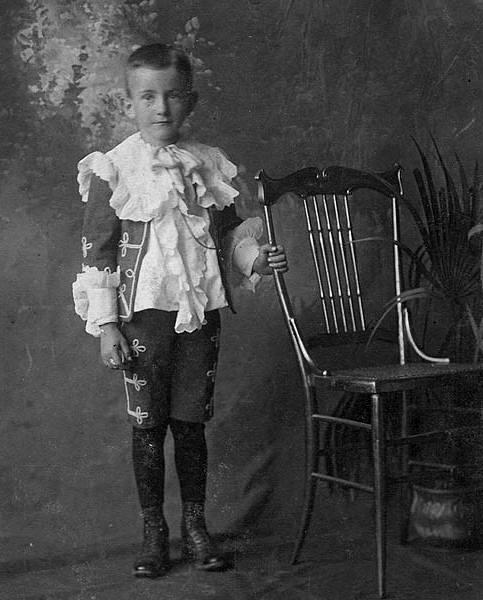 Some Fauntleroy cut-away jsckets were decorated rather like Zouave suits. Here we see a gooexample (figure 1). A reader writes, "This is a very interesting photo. I'm not sure that 'embroidery' is quite the right term here although I'm not totally sure. What is unusual is the application to the material of the suit of decorative 'frogs' (a sort of cord loop) that imitate the military decorations on the uniforms of hussars, members of military bands, and the like. Such embellishments, I think, are sometimes referred to as "appliqué". Anyway, I would say that the decorations are definitely military in origin."