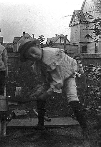 The Fauntleroy blouse is commonly seen as a formal dress up garment. This was especially the case of white blouses done in fine fabrics. And of course it certainly was. The Fauntleroy suit was a boy's best dress up garment, worn for parties, church, and other formal occassions. At the time, parents saw events as formal that we would now consider casual. Thus there were plenty of opportunities for a boy to wear these suits. Among them was a formal studio photographic portrait. these blouses were, however, not alwats worn for formal occassions. We see boys in the 1890s and 1900s wearing these blouses to school or even to play. These more casual blouses were still often elaborate wuith large ruffled collars, but done in less expensive cotton fabrics. We see them done in colors and patterns. And of course boys were less likely to wear nows with them. Social class was a factor here. A working-class boy might wear one of these less ecpensive blouses when dressing up while a more well-to-do boy might wear them as a play garment. Unfortunately when the Fauntleroy blouse was most popular in the 1880s-90s, snapshots were not very common. After 1900 when the Kodak Brownie made amateur photography easdier, we have snapshots better showing how these garments were worn. And they seem fairly standard for middle-class boy who by the 1900s we wearing them, but not as part of a formal Fauntlerpy suit. The boy here playing in a Fauntleroy blouse is a good example (figure 1). We see two brothers dressed up in whire Fauntleroy blouses. Becaiuse of the images taken at or near home, we think it is fairly easy to identify them as middle class families. .