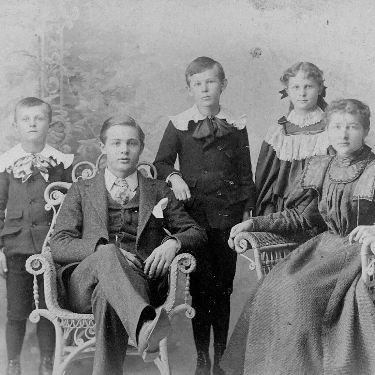 Some Fauntleroy blouses had matching wrist cuffs. An almost obligatory element of a Fauntleroy suit was a large, fancy collar. Many, but not all Fauntleroy suits had matching, equally fancy wrist cuffs. Actually these were not part of the suits, but the blouses worn with the suits. A classic Fauntleroy blouse also had lace and ruffled trim to match the collar trim. The cuffs varied greatly in length. They extended well beyond the boys hand and were designed to be folded back over the sleeves of the jacket Sometimes the cuff trim extended back to the boys elbow. This was not obligatory. We see many portraits with boys in fancy Fauntleroy suits without fancy cuffs. The fancy cuffs, however were very common. HBC is not sure about the precise construction of the fancy wrist cuffs which were often worn to match the ruffled or lace collars in Fauntleroy outfits. Some of the collars and cuffs were part of fancy blouses. This meant that the blouses were made with sleeve lengths exctending well beyond the boy's wrists. They were then doubled over adter he put on his jacket so they cobered the lower portion of the jacket sleeve. Others appear to have been separate items sewn on to the jackets. One HBC contributor believes that they were worn with cuff links. HBC is less sure of this and has not noticed cufflinks in either the photographic records of these suits or mentioned in the accompanying literature. The cuffs of course normally wee part of the blouse. Unlike the collars which could be pinned on, the cuffs were simply extensions of the blouse sleeves that were turned over. As the Fauntleroy style was especially popular in America, most of the examples we have found are American. Quite a few were done with these wrist cuffs. Most of the fancy blouses had them. A good example is Roy Swanson in the early-1900s. The standard Fauntleroy blouse was done with the matching cuffs. But we do see some without them. A good example is an unidentified boy, we think in the late-1890s.