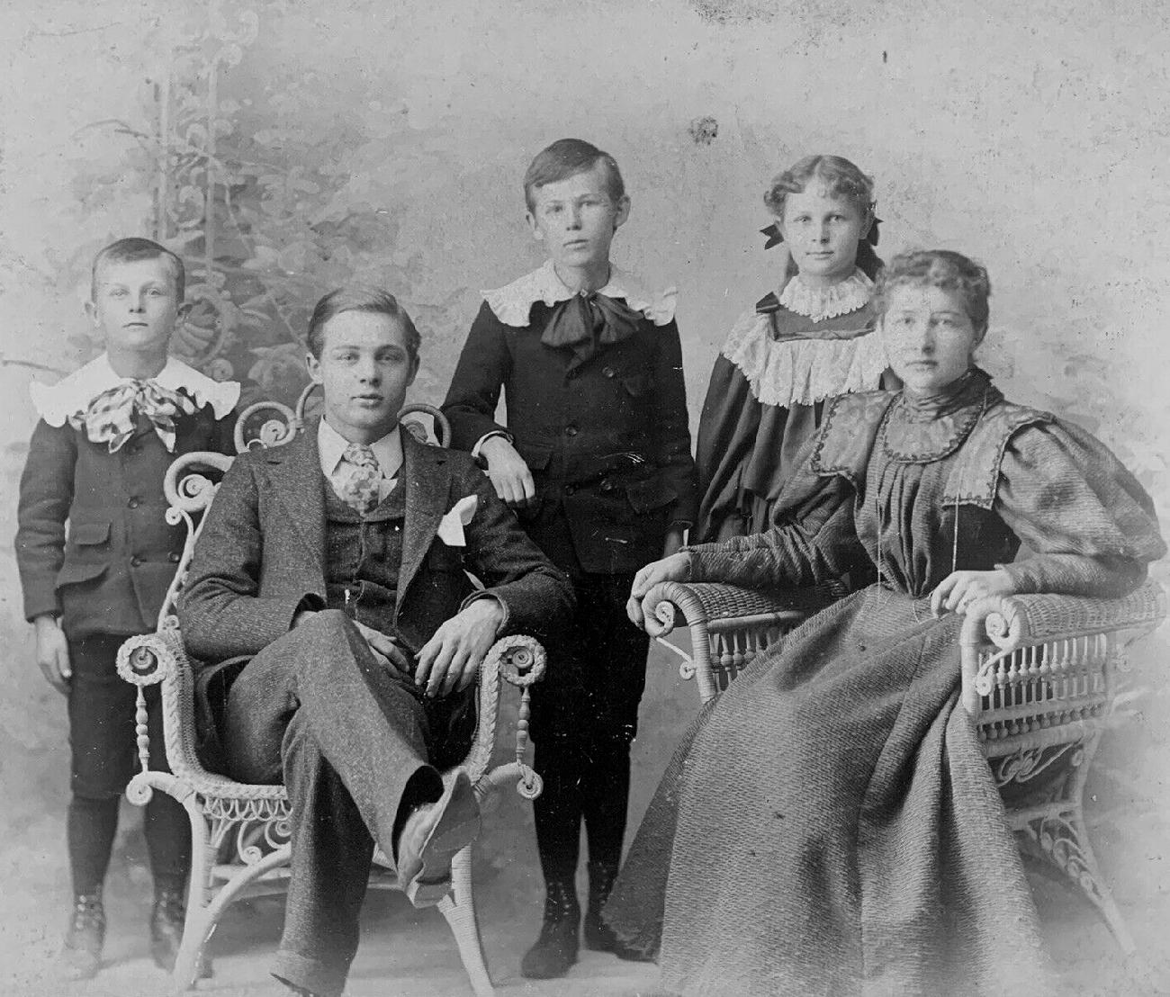 Here we see five children of an unidentified family. There are two girls and three boys. The two boys wearing Fauntleroy blouses and bows look to be avout 10-13 years old. Notice that the blouses have large frilled collars, but no wrist cuffs. The boys wear regular double-breasted knee pants suits with black long stockings. The cabinent card portraits are undated, but look like the late-1890s. The studio was G.C. Ragan in Hastings, Nebraska.