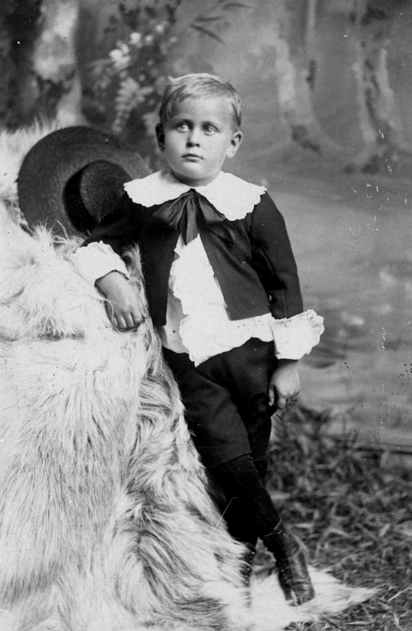 The broad-brimmed hats boys wore with Little Lord Fauntleroy were done in different colors. Unfortunately, all we can say from the photographic record. At this time all we can say is that we note light and dark colors. Many of these hats were done in straw. Thus we think the light colors are mostly natural straw. The dark hats are probably black, although because of the black-and white photography of the day we have no color information. Surely some, probably most, of the hats were black. Whether they were done in dark colors we are not sure. Black would make sense as so many Fauntleroy suits were black. There were, however, Fauntleroy suits done in colors like dark blue, brown, green, and maroon. Whether there were hats to match, we do not know. We notice a few hats which look to us a mid-ramge color, not natural color or dark. We suspect that these were a brown shade, but we have no actual information on this.
