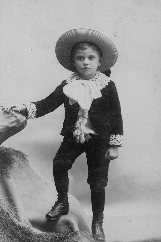 Many of these broad-brimmed hats worn with Fauntleroy suits were straw hats. We do not notice many other hat styles worn with Fauntleroy suits. Many of the hats we notice were straw hats, but we do notice some other materials, we think primarily felt, but not the hats with the really wide brims. The felt hats, however seem to be the smaller-brimmed rounded crown hats and not the broad-brimmed hats. This seema a mtter of practicality and perhaps costs. Straw was cheaper than felt. It was also easier to make the brod brims in straw than felt. Some suits had matching headwear. This was not the case with the broad-brimmed hats. While there is a strong association between the two garments, at least in the modern mind. Straw and velvet can, however, hardly be seen as matching. Although in some cases, mothers did select dark-colored straw to go with velvet suits, usually but not always black. We can see a dark straw wide-brimmed hat on theprevious page. Actual matching jeadwear seems more likely to be tams which might be done in velvet rather than these straw-wide brimmed hats.