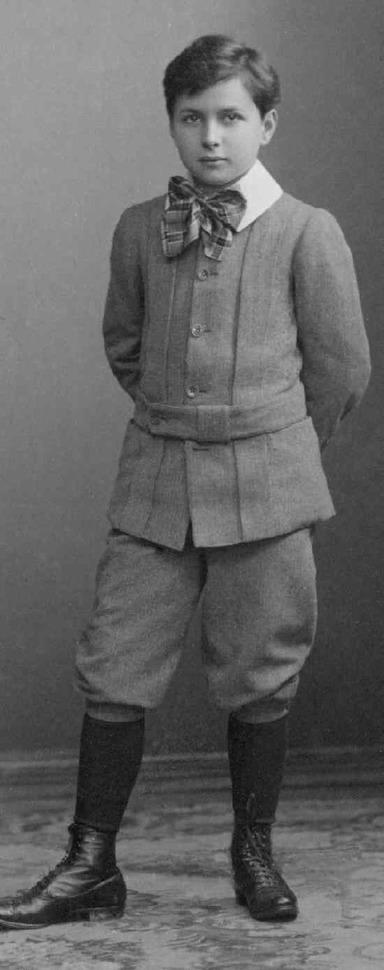 We note that mant German boys wore Norfolk jackets which buttoned at the collar rather than suit jackets with lapels. Age may have been a factor here. Also this style may have varied over time. The Norfolk styling of belts and pleats also varied. The boy here, foe example, had a define belt, but other aspects of the Norfolk styling are less pronounced (figure 1). Many available images look to be two-piece suits composed of jacket and knickers. We have also seen three-piece suits with an added vest (waistcoat). Most of the Eton jackets we have noted have been single breasted, but there were also doubled-breasted jackets as well.